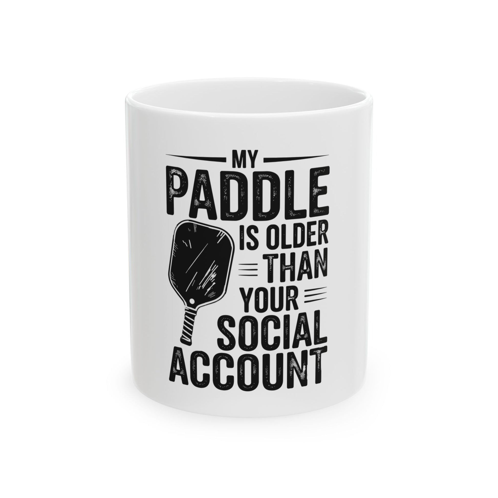 Show off your pickleball seniority with this fun ceramic mug! Featuring the humorous phrase "My Paddle is Older Than Your Social Media Account," it's perfect for enjoying your favorite hot beverage. Available in 11oz 15oz, size, it's lead and BPA-free, and safe for both microwave and dishwasher use.